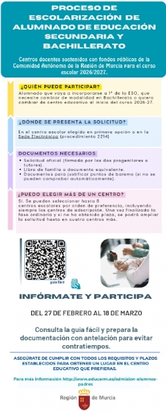 Para obtener más información del proceso, junto a la documentación correspondiente, se puede consultar la sección Admisión de alumnos del portalEducarm.
